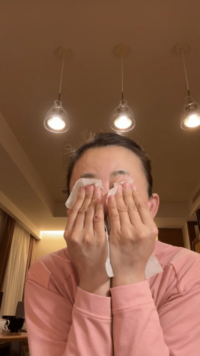 沖縄でのクリスマスプレミアムショーを終えて、ホテルの自室でのメイク落としから保湿までの一連の流れを視聴者に紹介しました。