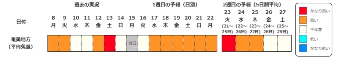 九州南部・奄美地方の向こう2週間の気温は、寒気の影響が弱く、暖かい空気が流れ込む日もあるため高い日が多く、20日頃からはかなり高くなる見込みです。農作物の管理等に注意してください。また、今後の気象情報等に留意してください。