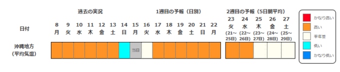 “10年に1度レベル”21日頃~ほぼ全国で「かなりの高温」か 日本列島が“真っ赤”に 気象庁が「高温に関する早期天候情報」を沖縄地方以外の全てで発表【全国の天気予報・週間天気で気温をチェック】 青森テレビ 2025年12月15日(月) 23:15 国内 2週間気温予報(沖縄地方) ♦各地の高温に関する早期天候情報と2週間気温予報 (北海道・東北・北陸・関東甲信・東海・近畿・中国・四国・九州北部・九州南部と奄美・沖縄) ♦全国の天気予報・週間天気 ♦記事を最初から見る
