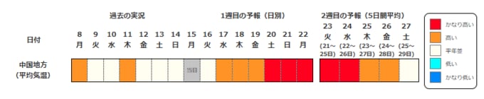 中国地方の向こう2週間の気温は、寒気の影響が弱く、暖かい空気が流れ込む日もあるため高い日が多く、20日頃からはかなり高くなる見込みです。農作物の管理等に注意してください。また、今後の気象情報等に留意してください。
