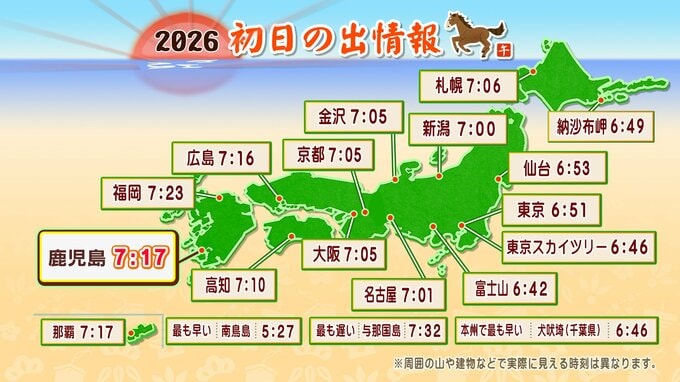 【元日の天気】初日の出 見られる?「カレンダーで見る 2026年1月1日までの天気予報」初日の出情報・時間【年末年始の天気予報】 南日本放送 2025年12月16日(火) 20:00 国内 天気 初日の出情報 初日の出時刻は、 東京スカイツリー6:46 富士山6:42 札幌7:06 仙台6:53 東京6:51 名古屋7:01 大阪7:05 福岡7:23 です。周囲の山や建物のために実際に見える時刻は異なります。