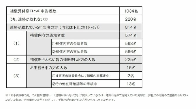 公式サイトでは「被害者救済委員会は被害補償の受付開始後、本日時点までに、合計1034名の方から補償申告をいただいております。そのうち220名の方は、複数回のご連絡を試みてもご返信がない状態です。」と、投稿。