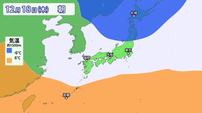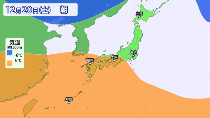 上空約1500mの暖気と寒気の予想を見ても、週後半にかけて暖気が流入することが分かります。このオレンジ色の暖気に覆われて日中晴れれば、気温が20度ほどまで上がる可能性があります。北からの寒気の流れ込みも弱く、全国的に気温が次第に高くなる傾向です。