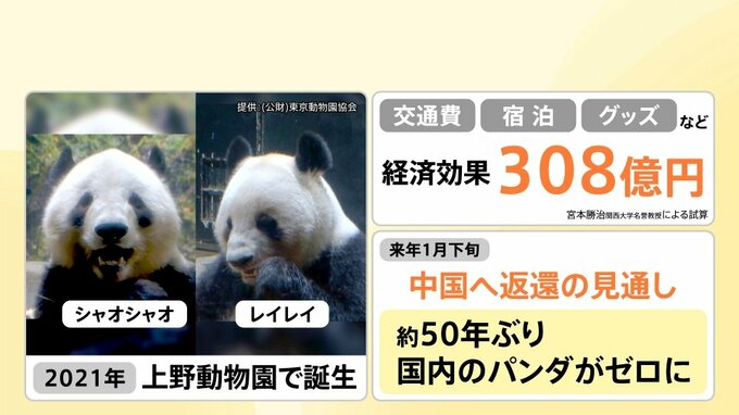 これまで様々な経済効果を生んできていて、関西大学・宮本名誉教授の試算によると、交通費や宿泊やグッズなどで、経済効果は308億円にのぼるそうです。この経済効果も、パンダの返還によって薄れてしまうということです。