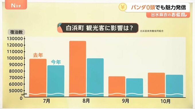 7月~10月の期間を2024年の宿泊数と比較した白浜温泉旅館協同組合の調査によると、やはり少しずつ減っています。