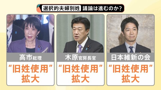 旧姓使用拡大に強い思いを持っていたのは、他ならぬ高市総理です。ライフワークと言っても差し支えないと思いますけれども、旧姓使用拡大に重きを置いていました。木原官房長官や日本維新の会も「“旧姓使用”の拡大」を推進しようとしています。