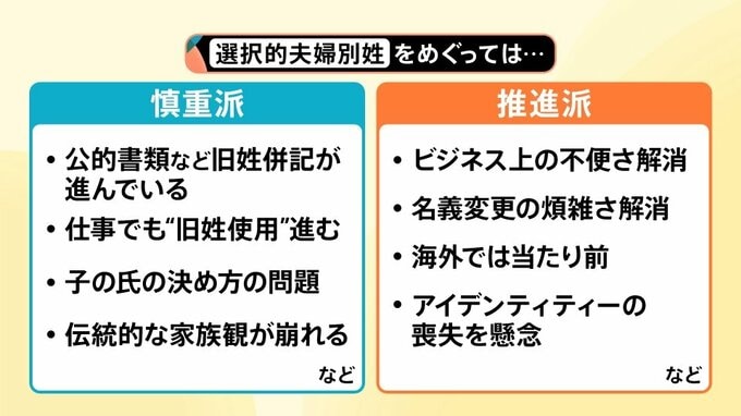 選択的夫婦別姓をめぐって、慎重派と推進派の意見は以下の通りです。