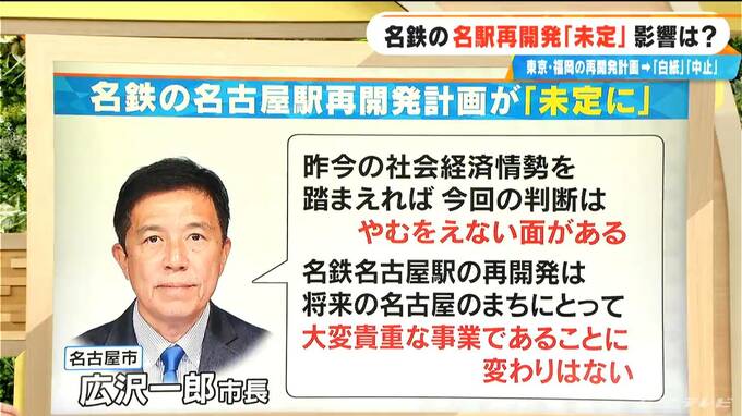 「昨今の社会経済情勢を踏まえれば、今回の判断はやむを得ない面がある。名鉄名古屋駅の再開発は、将来の名古屋のまちにとって大変貴重な事業であることに変わりはない」としました。