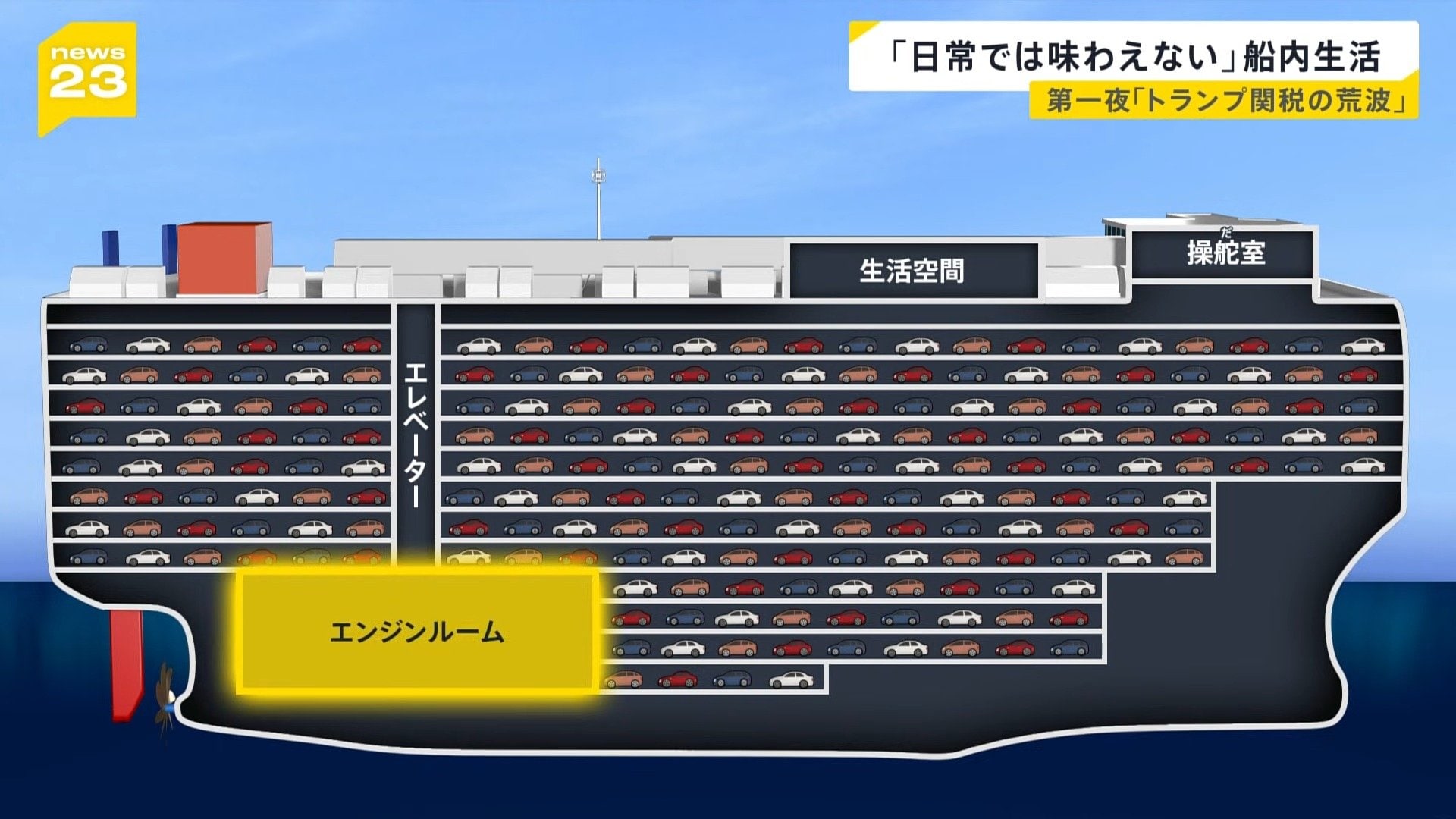 自動車船は12階建てのいわば“動く立体駐車場”。操舵室や生活スペースは上の部分に、エンジンルームは下に位置しています。