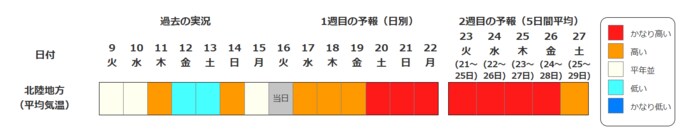 北陸地方の向こう2週間の気温は、寒気の影響が弱く、暖かい空気が流れ