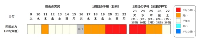 四国地方の向こう2週間の気温は、寒気の影響が弱く、暖かい空気が流れ