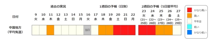 中国地方の向こう2週間の気温は、寒気の影響が弱く、暖かい空気が流れ
