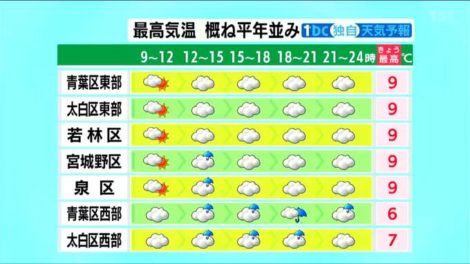 ■宮城野区:9℃ ■泉区:9℃ ■青葉区西部:6℃