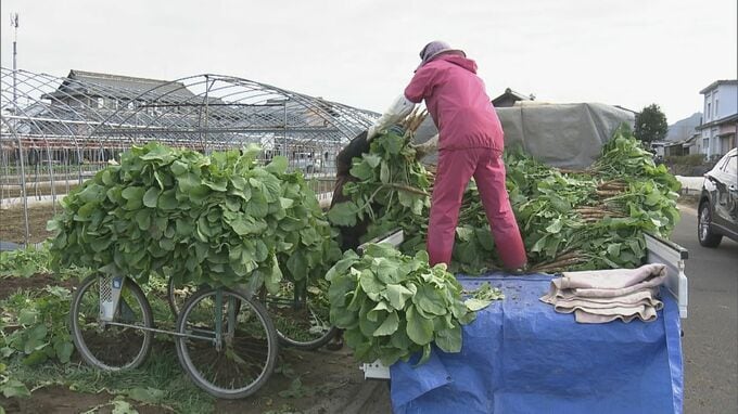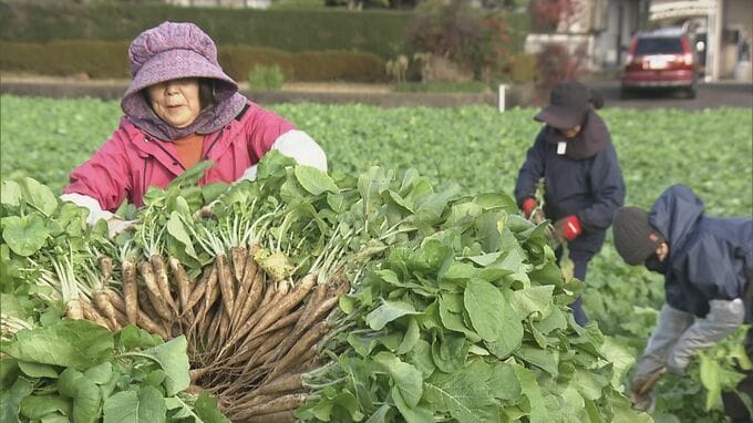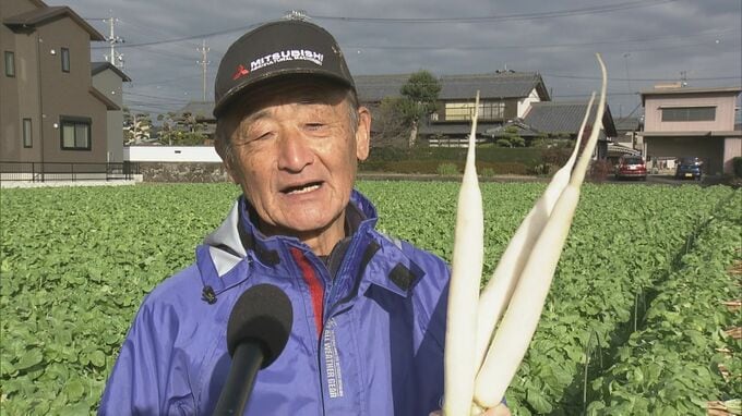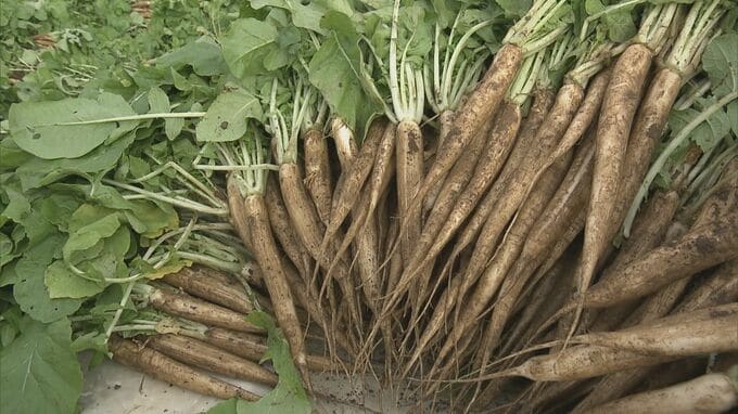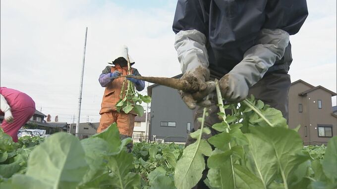 岐阜市内の畑では、正月を前に祝だいこんが次々と手際よく収穫されていきました。ことしは天候に恵まれ順調に生育したたため、とてもよい出来だということです。
