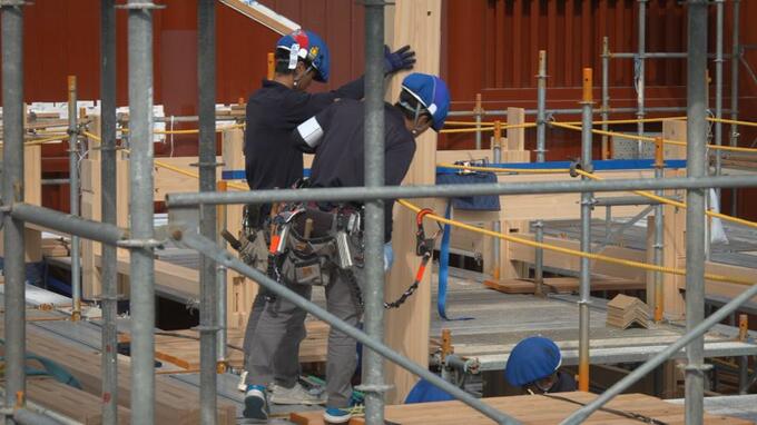 屋根瓦が葺かれ外壁塗装も完了した首里城正殿の再建現場では、今月3日から最終工程のひとつである廊下の骨組み造り、「建て方工事」がスタートしました。