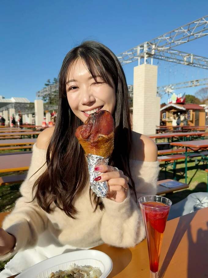 穂川さんは「東京クリスマスマーケット神宮外苑に行ってきたよ」と快晴の中、大きなチキンを手に、ウィンクするカットを掲載。