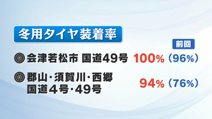 12月12日に郡山国道事務所(福島県郡山市)が管内の主な交差点で行った調査によりますと、冬用タイヤを装着していたのは、384台中369台で1週間前の調査と比べて12ポイント高い96%でした。