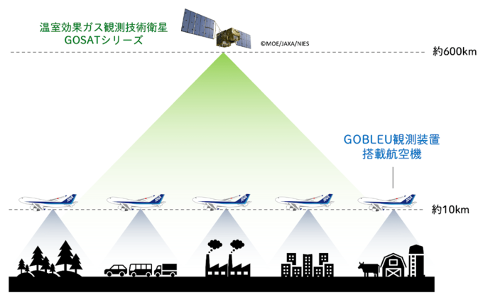 高度約666kmを飛ぶ衛星は地球を広く見るのが得意ですが、高度約10kmを飛ぶ航空機は、より地上に近く、都市ごとの詳細なデータを高頻度で集めることができます。