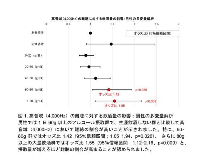 年齢、喫煙、生活習慣病の有無などの影響も考慮して解析した結果、男性では1日60g以上のアルコール摂取群で、生涯飲酒しない群と比較して高音域(4,000Hz)で難聴の割合が高いことが示されました。