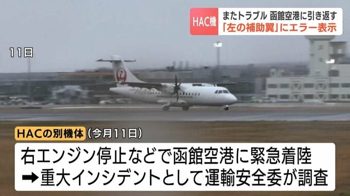 北海道エアシステムをめぐっては今月11日にも別の機体の右のエンジンが停止するなどして函館空港に緊急着陸していて、国の運輸安全委員会が重大インシデントとして調査に乗り出しています。