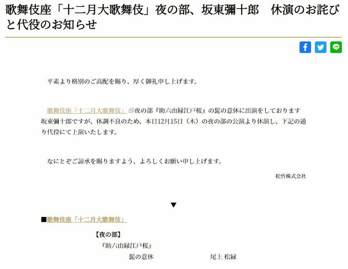 歌舞伎座「十二月大歌舞伎」夜の部、坂東彌十郎 休演のお詫びと代役のお知らせ
