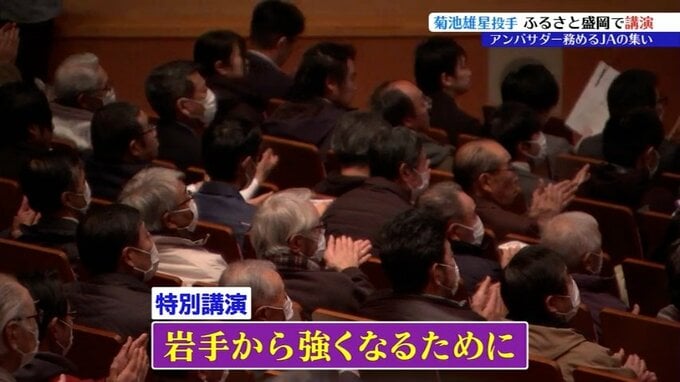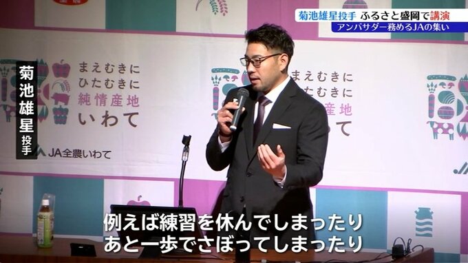 16日は生産者を前に「岩手から強くなるために」と題して講演し、菊池投手が目標を達成するために大切にしている考え方を披露しました。