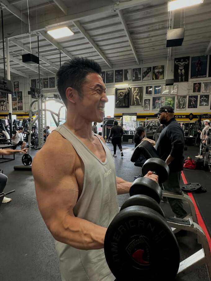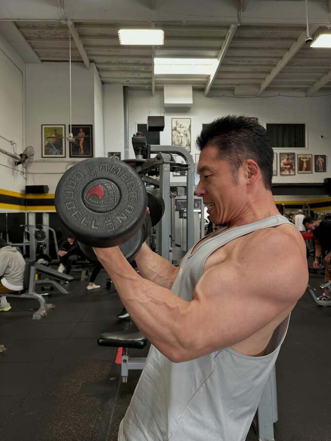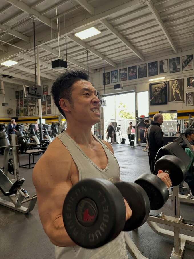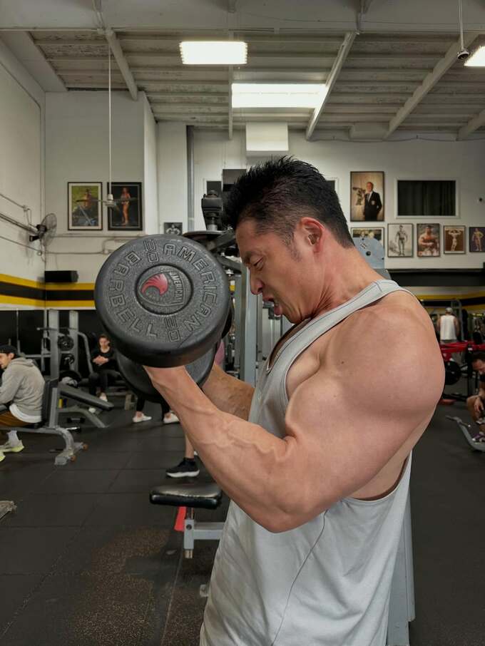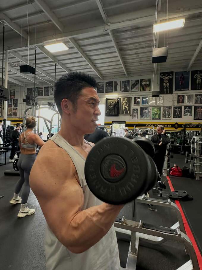 なかやまきんに君は、グレーのノースリーブシャツを着用し、ジム内でのダンベルを使ったトレーニングの様子を公開。集中した表情で黒いダンベルを握り、肘を体側に固定して筋トレを行う姿が映っています。