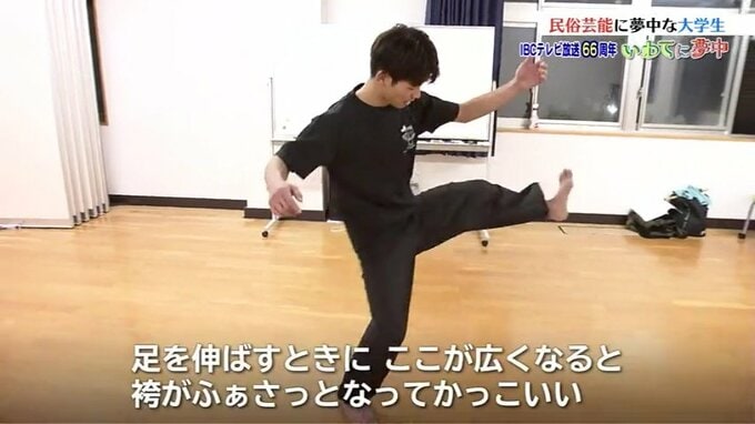 「袴着て踊る踊りなので、『袴払い』っていう、やってみていいですか?(実演)この、足を伸ばす時のここが広くなると、袴がふぁさっとなってかっこいいので、ここがかっこよくできると、やっぱり全体として細かいところまでできててかっこいいなって思う踊りだと思います」