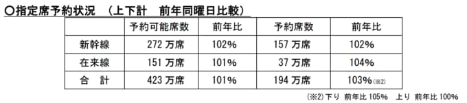それによりますと、12月26日~1月4日までの10日間の新幹線などの指定席予約数は15日時点で約272万席のうち、約157万席が予約済み(前年比102%)で、去年より増えています。