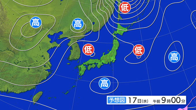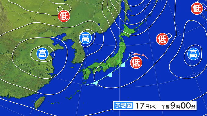 17日午前9時の予想天気図です。山陰沖に低気圧があり、東南東に進む見込みです。