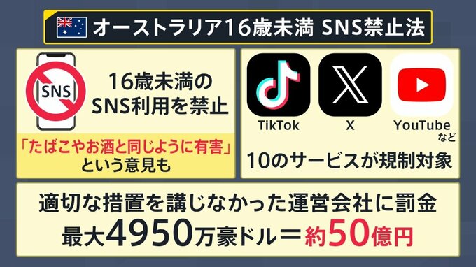 「TikTok」や「X」など10のサービスが対象になっており、適切な措置を講じなかった運営会社には罰金として、日本円で最大約50億円の罰金が科されるというルールになっています。