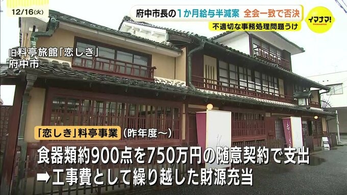 2024年度から始めた料亭事業「恋しき」をめぐっては、料理人の好みに沿うために食器類約900点を750万円で随意契約により支出し、費用は工事費として繰り越した財源を流用。また、料理人を府中市まで送迎する市職員に特例で旅費を支払うなどして、9月の市議会で決算認定が不認定となりました。