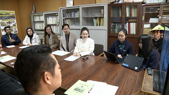 互いの国の教育の質の向上につなげようと操南中学校が招待し実現したもので、一行はまず、生徒から学校についての説明を受けました。