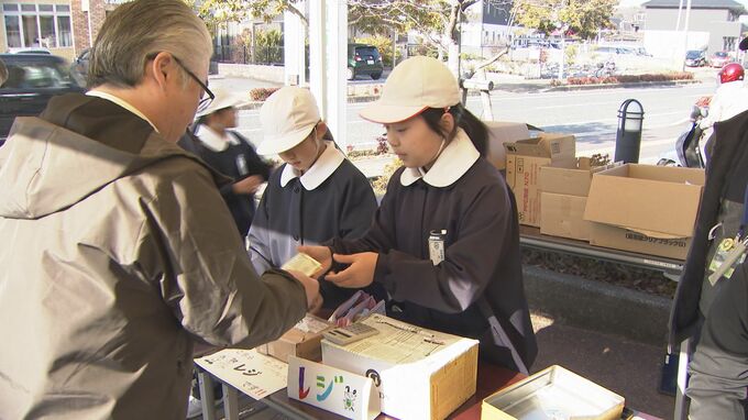 コメは学校の伝統行事になっている「田んぼアート」をつくるため、児童が6月に田植えをしたものです。田んぼアートは田布施町が合併70周年を迎えたことから数字の「「70」と「おにぎり」のデザインで10月に稲刈りをしました。袋には、赤米など色が違う3種類が入っています。児童は呼び込み、販売、会計とチームに分かれて手際よく販売していました。