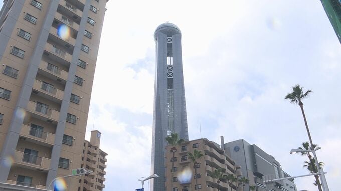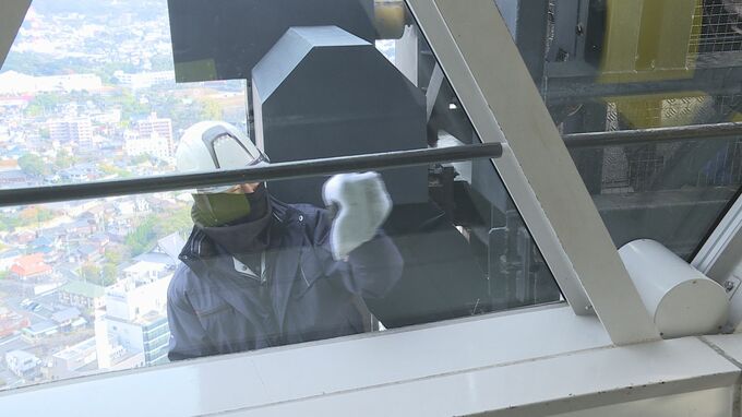 足がすくむような高さですが、作業員はゴンドラに乗り、作業します。潮風やほこりなどの影響で、汚れが目立つ場所もありましたが、1枚1枚、丁寧にガラスを磨いていました。17日までに172枚のガラスをきれいにする予定です。