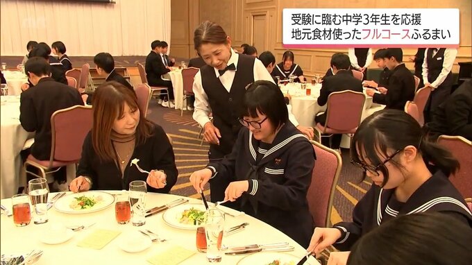 これから受験に臨む新富町の中学3年生に、フルコースの昼食がふるまわれました。16日、新富町の中学3年生およそ200人が宮崎市のホテルに招かれました。受験控えた生徒たちを応援しようと用意されたのは、新富町産…
