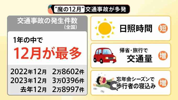 12月は、▼日照時間が短く、▼帰省・旅行で交通量が増える、▼忘年会シーズンで歩行者が寝込んでしまい事故に巻き込まれるといった状況が、事故が増える要因となっています。