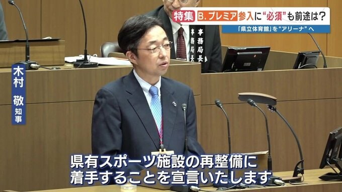 木村敬知事「県有スポーツ施設の再整備に着手する事を宣言いたします。県立総合体育館に関しては、アリーナ建設として現地再整備を行います」