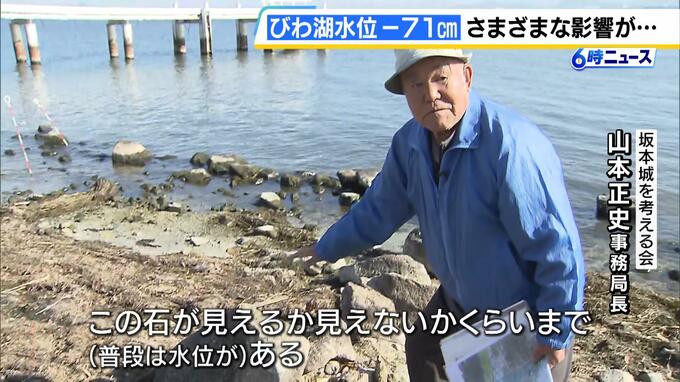 「(石垣が見られることは)明智光秀からこの地域へのプレゼントだと思っている。滋賀県民としては水がこんなに減ったら、漁業者が困る。うれしいけど、半分以上悲しい」