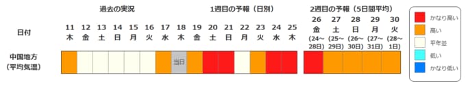 中国地方の向こう2週間の気温は、寒気の影響が弱く、暖かい空気が流れ込む日もあるため高く、かなり高くなる日もあるでしょう。