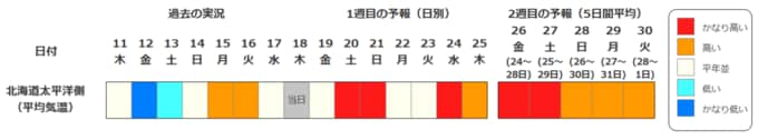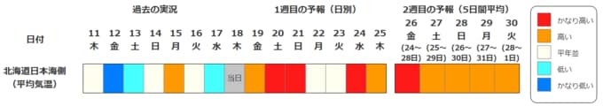北海道地方の向こう2週間の気温は、寒気の影響が弱く、暖かい空気が流れ込む日もあるため平年並か高い日が多く、24日頃からはかなり高くなる可能性があります。