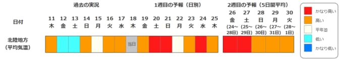 北陸地方の向こう2週間の気温は、寒気の影響が弱く、暖かい空気が流れ込む日もあるため高く、かなり高くなる日もあるでしょう。