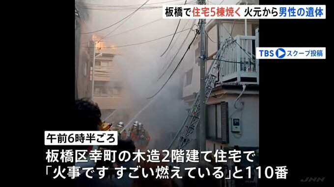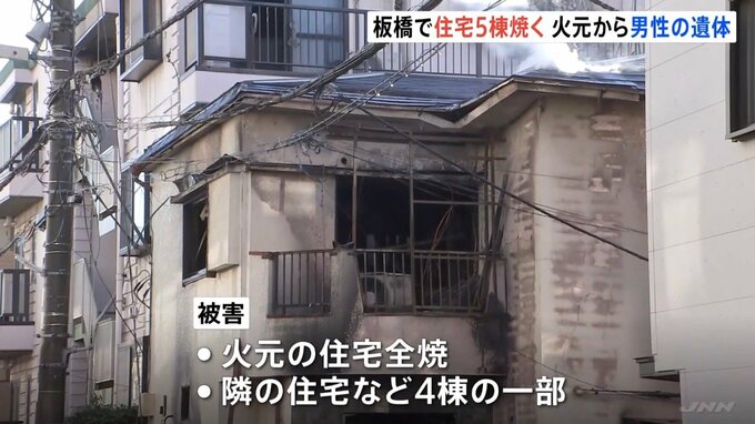 けさ早く、東京・板橋区で住宅5棟を焼く火事があり、火元の住宅から男性の遺体が見つかりました。