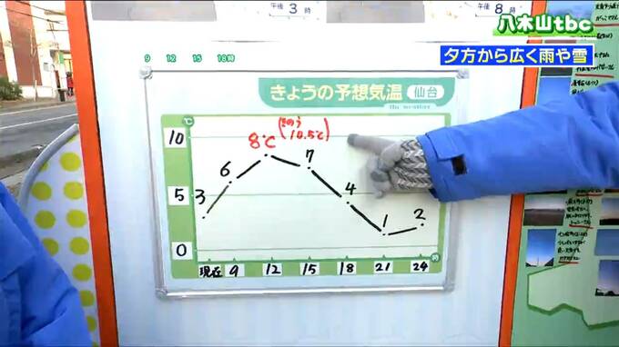 昨日は予想以上に気温が上がり、仙台は10.5℃まで上がりました。それに比べると、今日は2℃から3℃低いところが多くなりそうです。