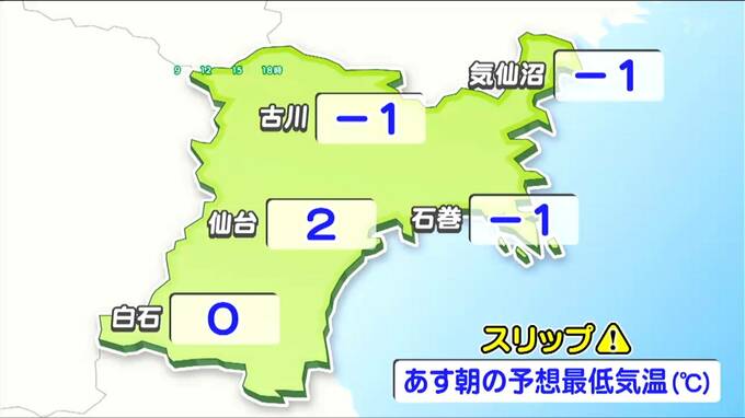 仙台はプラス2℃の予想ですが、他の地域は広い範囲で氷点下となります。今日の夕方以降、広い範囲で雨や湿った雪が降るため、明日の朝は広い範囲で湿潤だった路面が凍りつくおそれがあります。明日の朝は平地でもスリップにご注意ください。