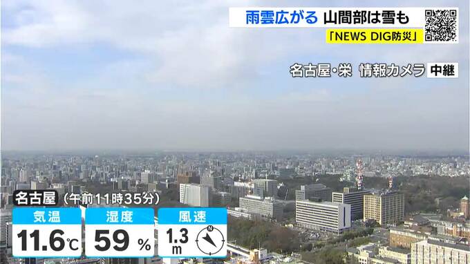 朝はすっきりと晴れていましたが、正午前の名古屋市内は雲が広がっています。気温は11.6℃、湿度は59%で、風は強くありません。