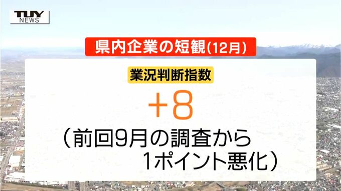 日銀山形事務所によりますと、県内の景気が「良い」と回答した企業の割合から、「悪い」と回答した企業の割合を差し引いた12月の業況判断指数は、前回9月の調査から1ポイント悪化しプラス8となりました。