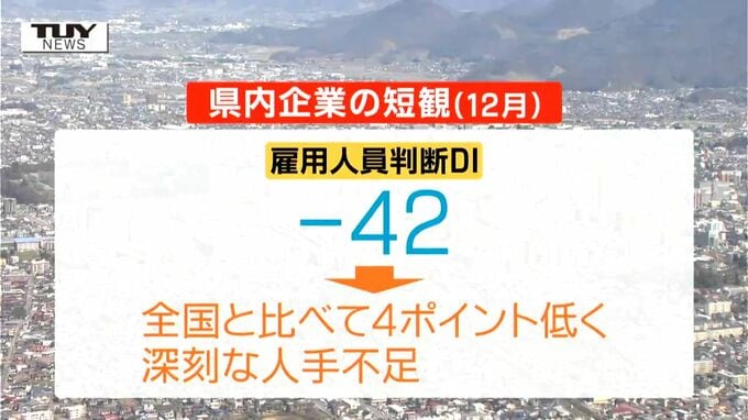 また、企業の雇用人員の過不足を示す雇用人員判断指数はマイナス42で、前回に続き大幅な不足となりました。全国と比べて4ポイント低く、深刻な人手不足です。