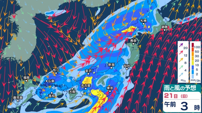 雨と風の予想シミュレーションをみてみると、20日(土)~21日(日)にかけて“雨の影”が西日本→東日本へと進み、21日の朝には、関東・東海・甲信・北陸などに活発な雨雲がかかる時間帯があることがみてとれます。“雨の影”は週明け22日(月)には日本にから離れていくようです。ただし、シミュレーションは日々更新されているため、最新の情報に留意して下さい。