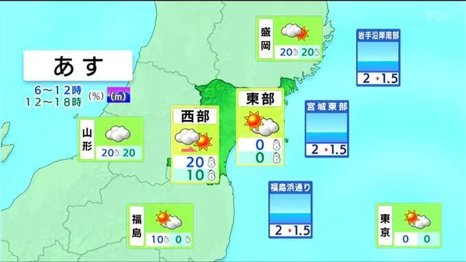 南部を中心に晴れるでしょう。北部では昼前まで雲が多いですが、午後は各地で青空が広がりそうです。海上では、北西の風がやや強く吹くでしょう。